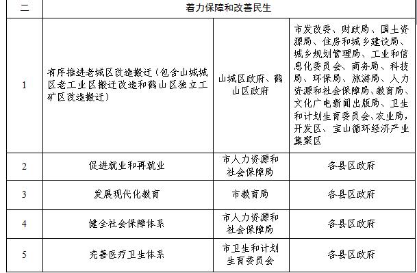 1.有序推进老城区搬迁改造。积极争取国家专项资金和专项建设基金支持,进一步完善提升鹤山区独立工矿区和山城城区老工业区搬迁改造实施方案,加快推进中心城区工业企业“退二进三”进程,着力改善道路交通、供水供电、污水管网等基础设施条件,完善中小学校、公共卫生机构、职业技能培训机构等公共服务设施建设,加快接续替代产业发展平台建设,加快城区危房、危楼、棚户区及采煤沉陷区异地搬迁或就地改造,推动老城区持续健康发展,力争山城区和鹤山区在资源型城市转型、新老区统筹协调发展中发挥先行示范效应。