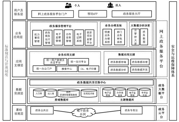 (三)网上政务服务平台。承载政府部门政务服务系统,包括网上政务服务平台门户、政务服务APP、权力事项管理系统、政务服务运行管理系统、电子监察系统、电子证照管理系统、投资项目在线监管平台等,以及统一用户管理、认证平台、统一支付平台等各类业务应用共享能力支撑和数据共享能力支撑。