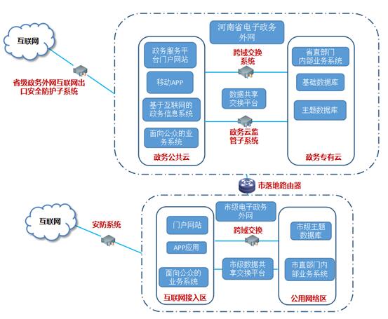 (一)政务公共云:承载基于互联网的政务信息系统和面向公众服务民生的业务应用,部署内容包括全省统一的网上政务服务平台门户网站、手机APP、移动应用汇聚平台、省政府门户和各部门网站等。已建政务云平台的省辖市、省直管县(市),可从云上划出逻辑分区实现公共云功能,统一将所属县(市、区)纳入服务范围,并与省级公共云互联互通。未建政务云平台的省辖市、省直管县(市),要依托省政务公共云平台实现相应功能。