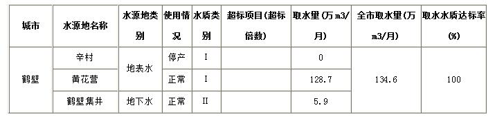 2017年3月,全市共取用2个在用集中式生活饮用水水源,其中地表水水源黄花营、地下水水源鹤壁集井。