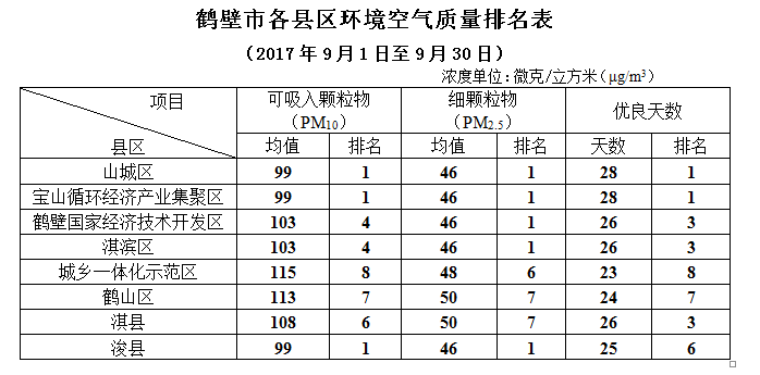 鹤壁市2017年9月各县区环境空气质量排名