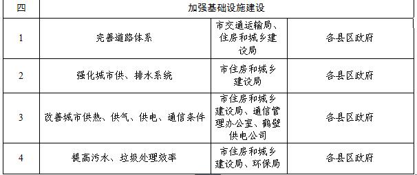 1.有序推进老城区搬迁改造。积极争取国家专项资金和专项建设基金支持,进一步完善提升鹤山区独立工矿区和山城城区老工业区搬迁改造实施方案,加快推进中心城区工业企业“退二进三”进程,着力改善道路交通、供水供电、污水管网等基础设施条件,完善中小学校、公共卫生机构、职业技能培训机构等公共服务设施建设,加快接续替代产业发展平台建设,加快城区危房、危楼、棚户区及采煤沉陷区异地搬迁或就地改造,推动老城区持续健康发展,力争山城区和鹤山区在资源型城市转型、新老区统筹协调发展中发挥先行示范效应。