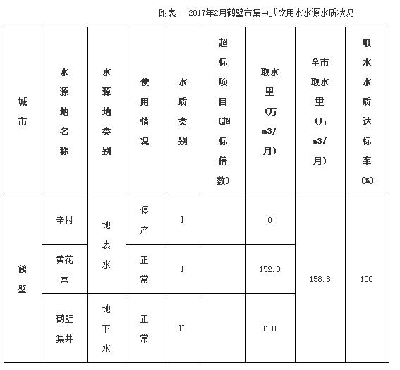 2017年2月,全市实际取用黄花营、辛村2个在用集中式饮用水水源,均达标,为100%(详见附表)。